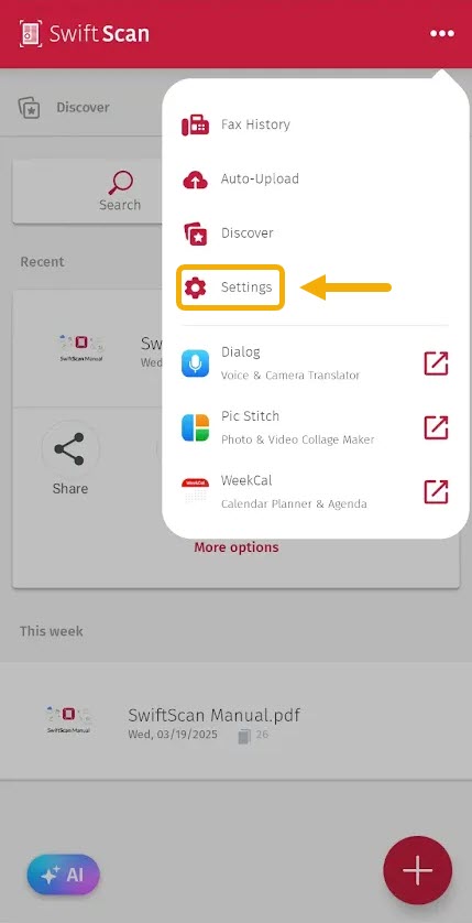 - Go to SwiftScan Settings – Open the SwiftScan app and tap on the Settings icon.